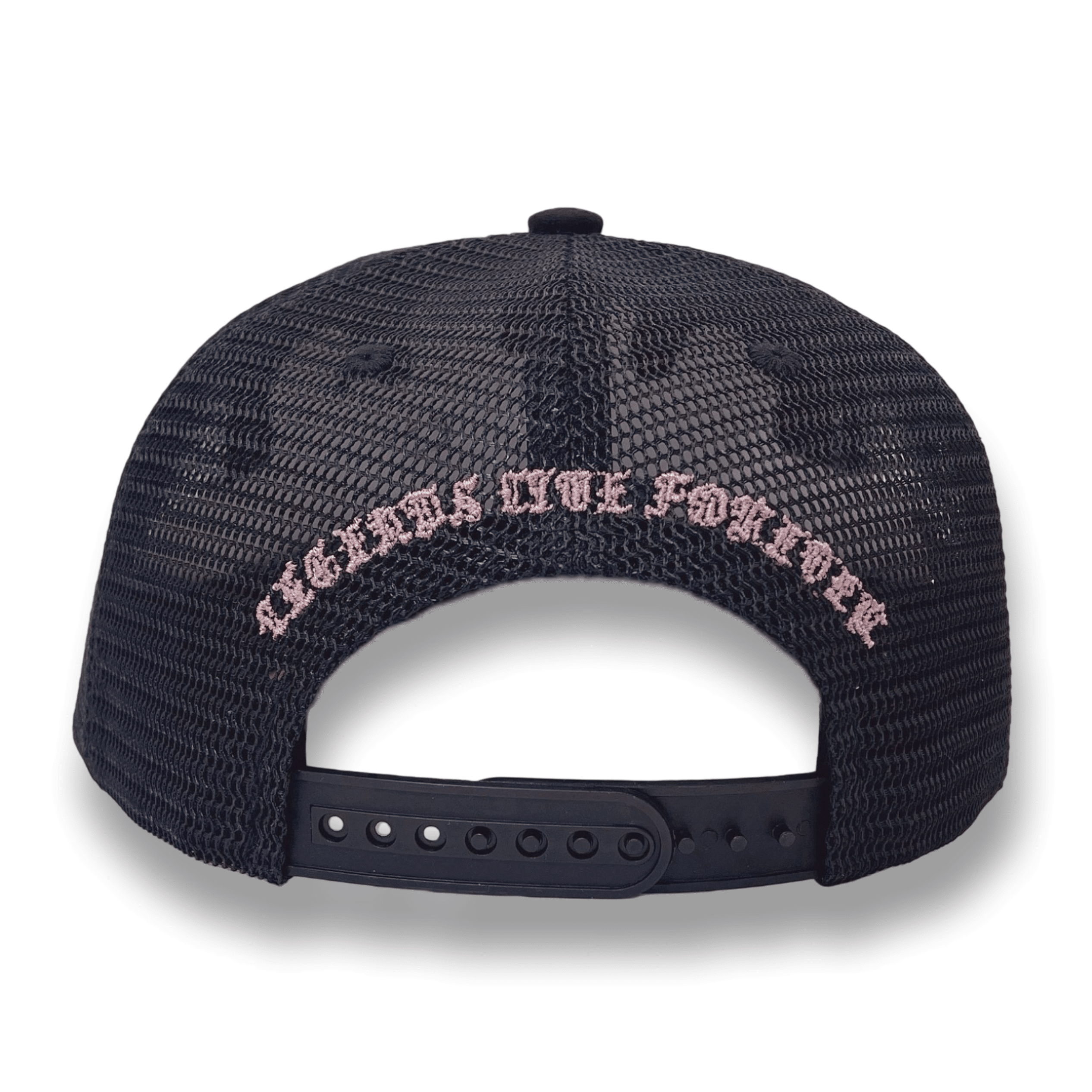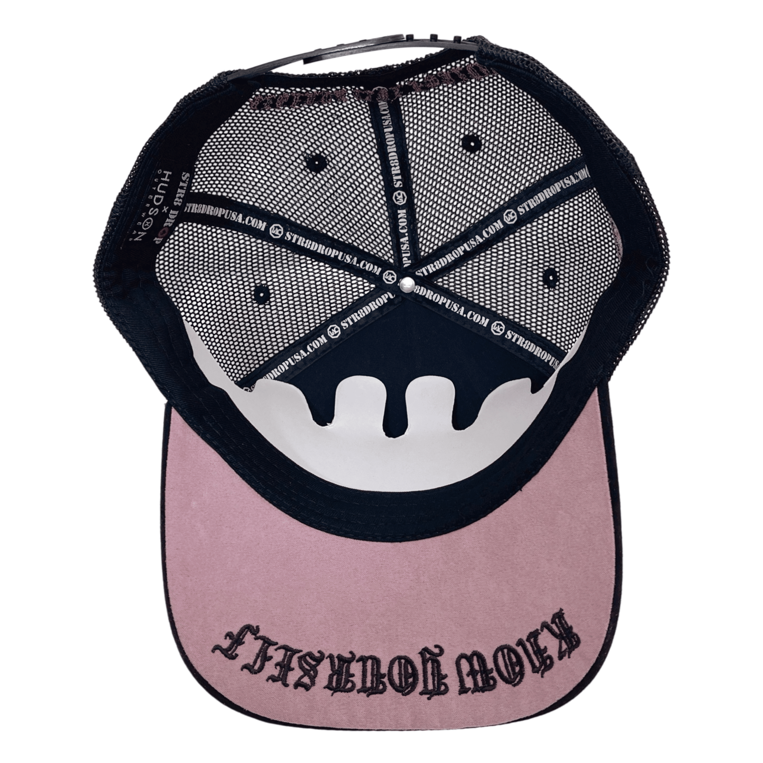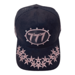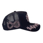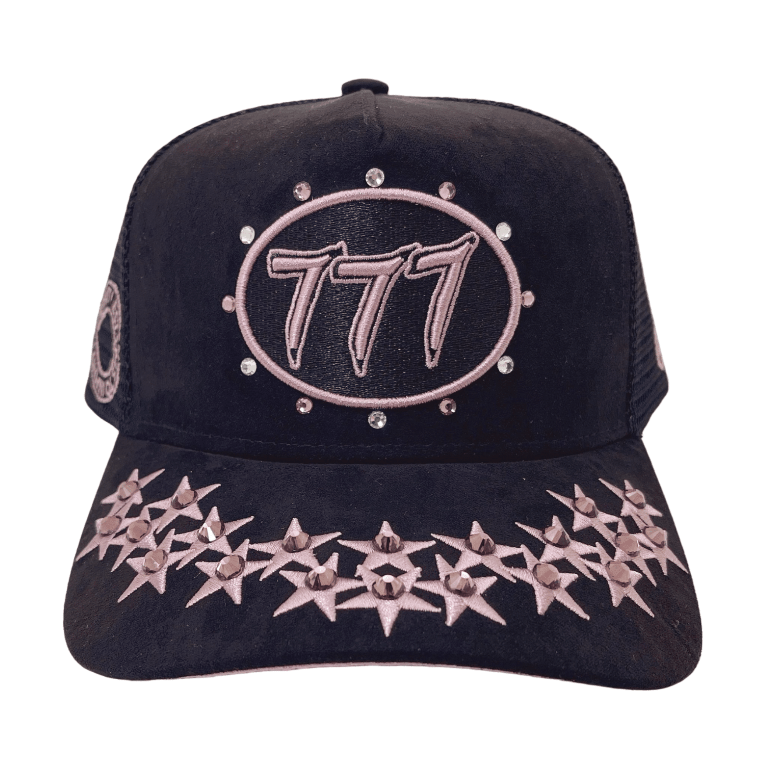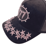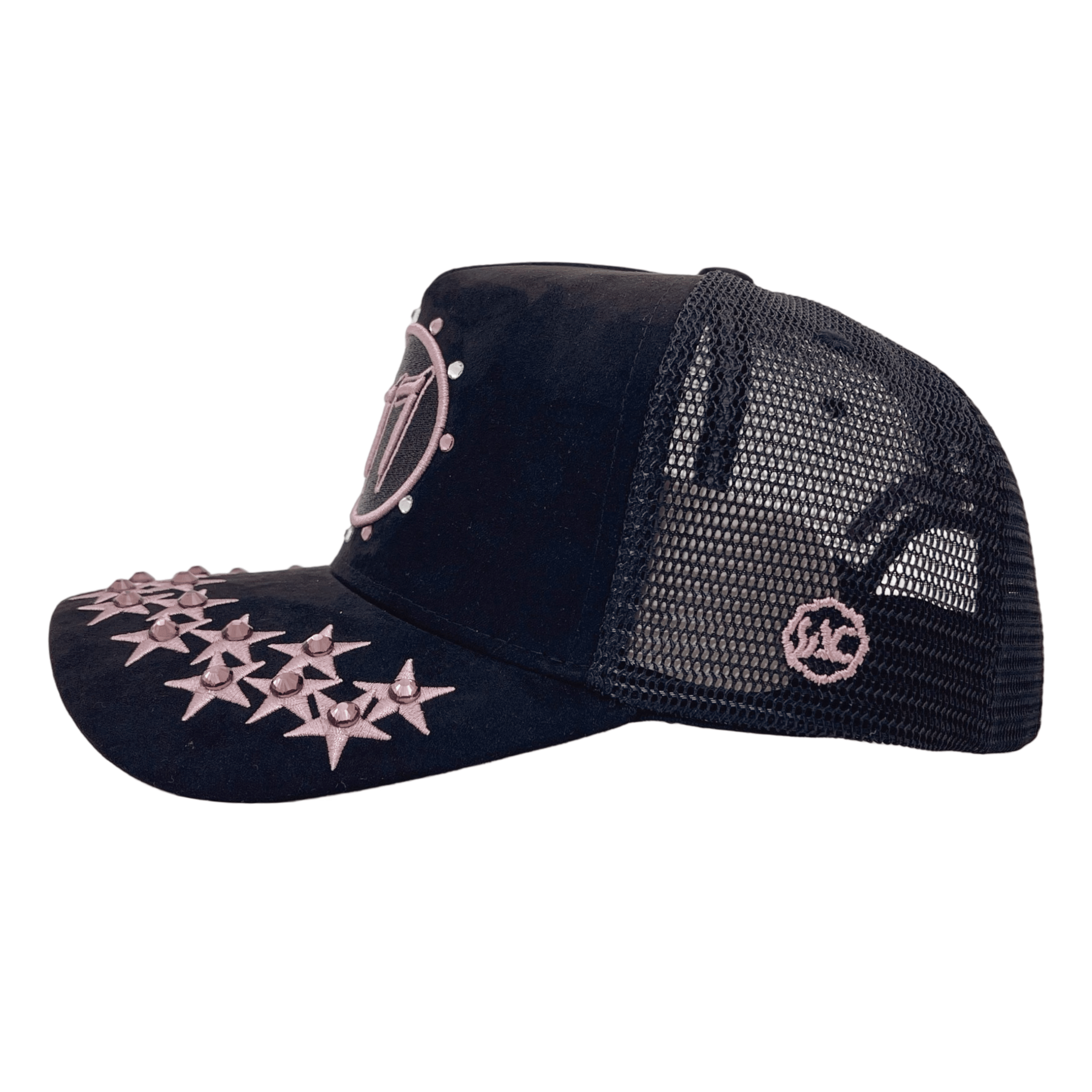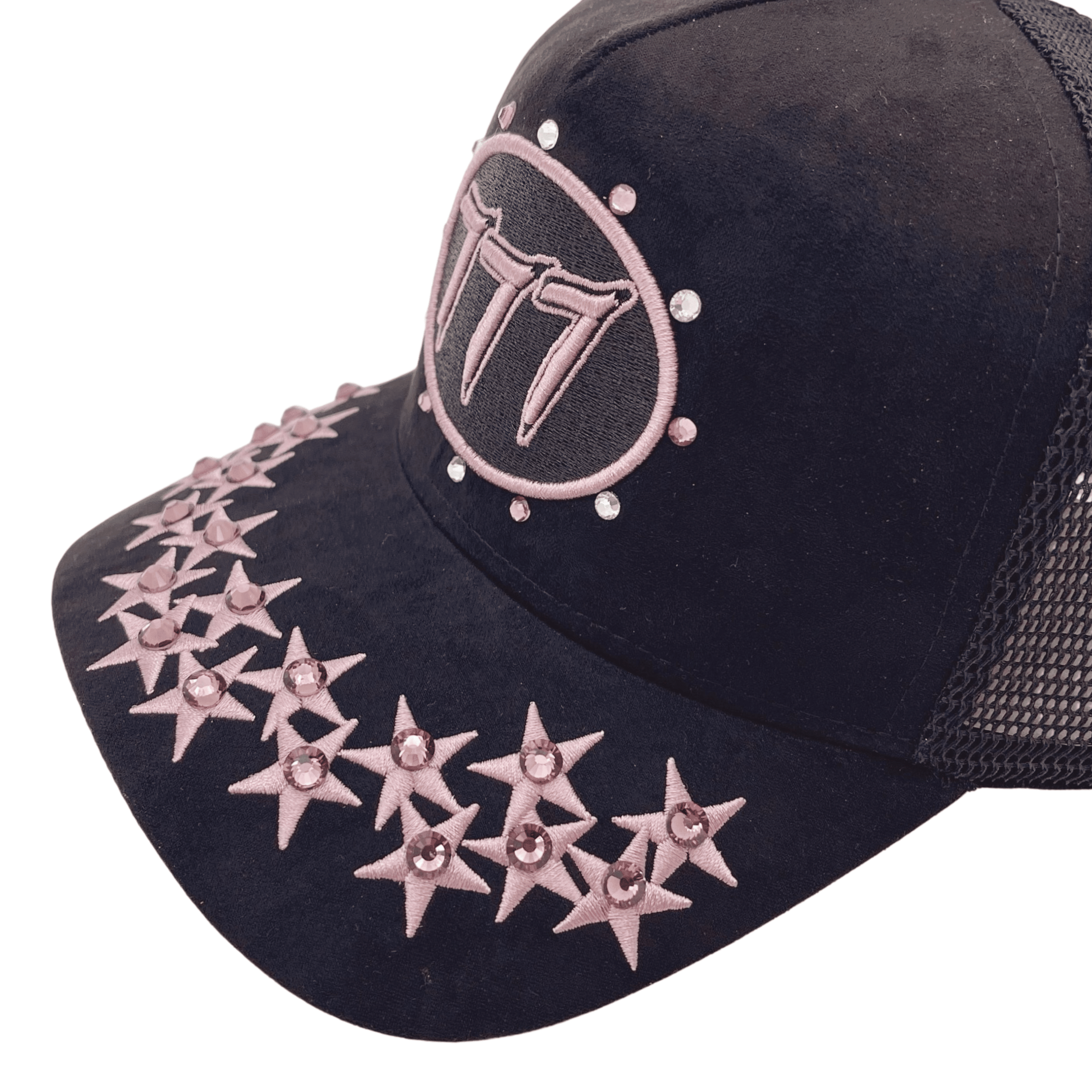 Premium quality black suede rhinestone trucker cap with mesh on side and back panels, adjustable snap, fits all sizes.