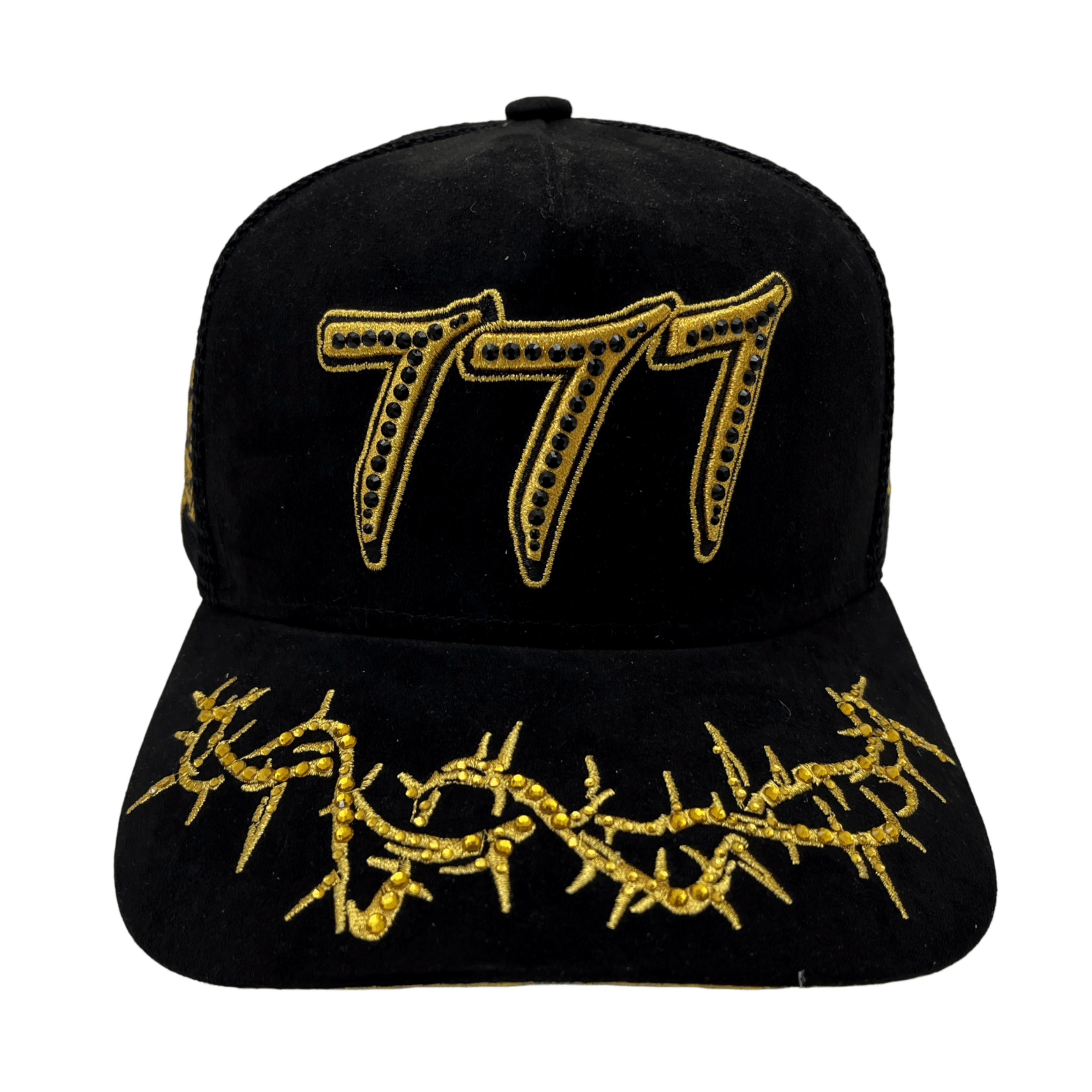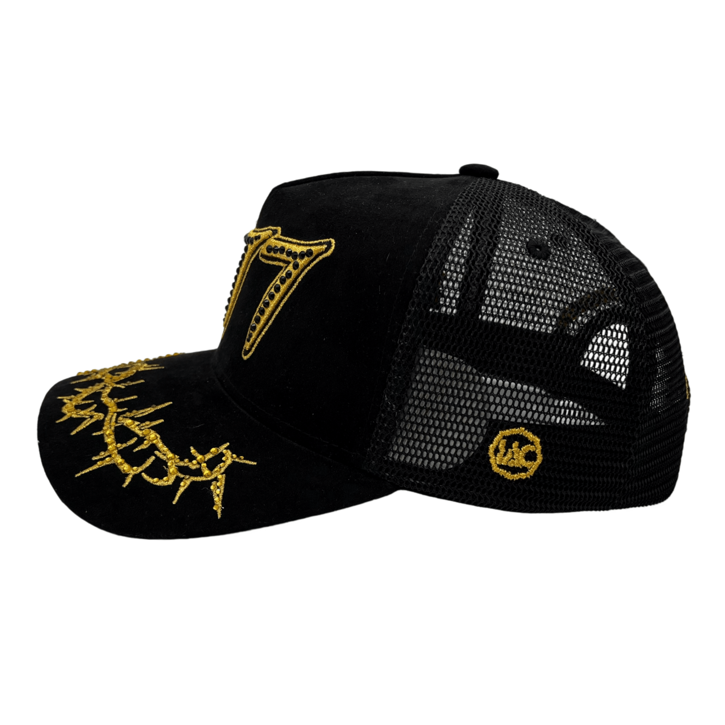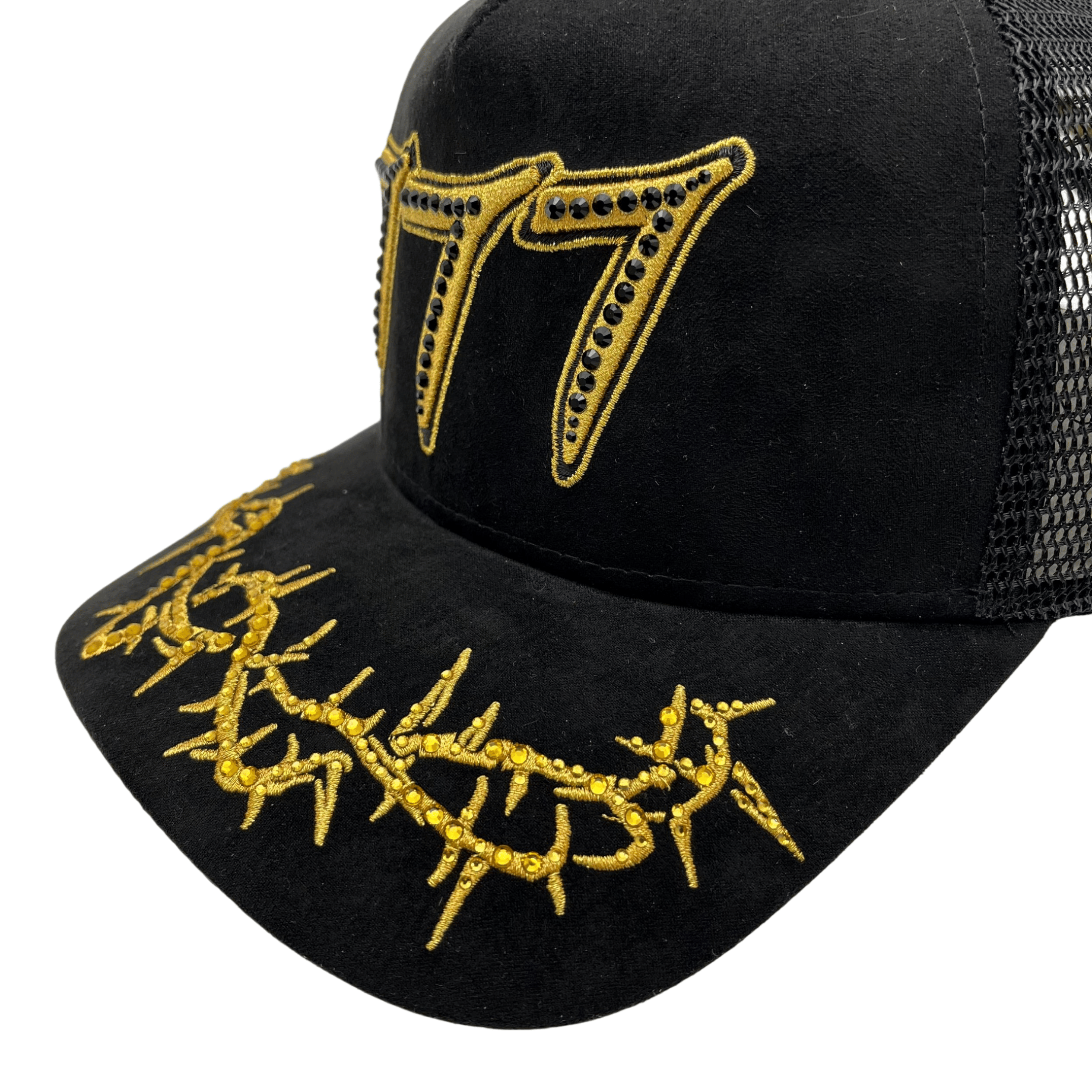 Premium quality black suede rhinestone trucker cap with mesh on side and back panels, adjustable snap, fits all sizes.