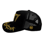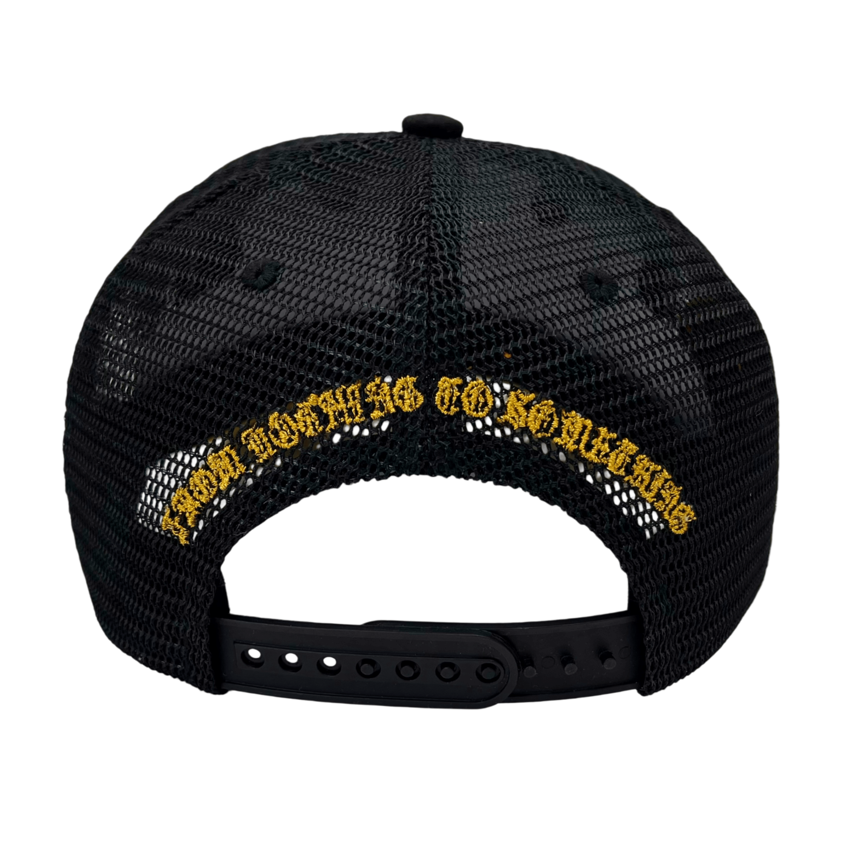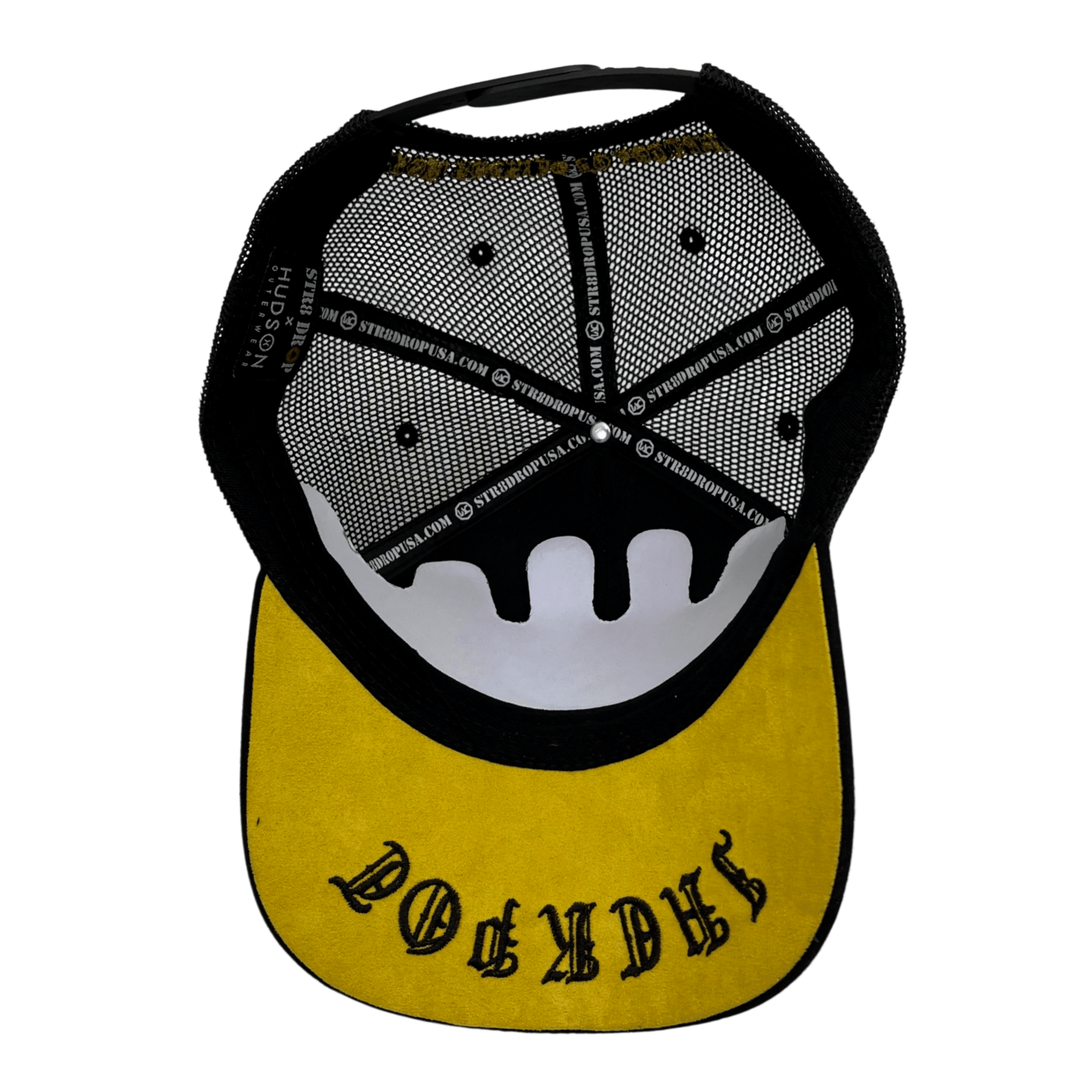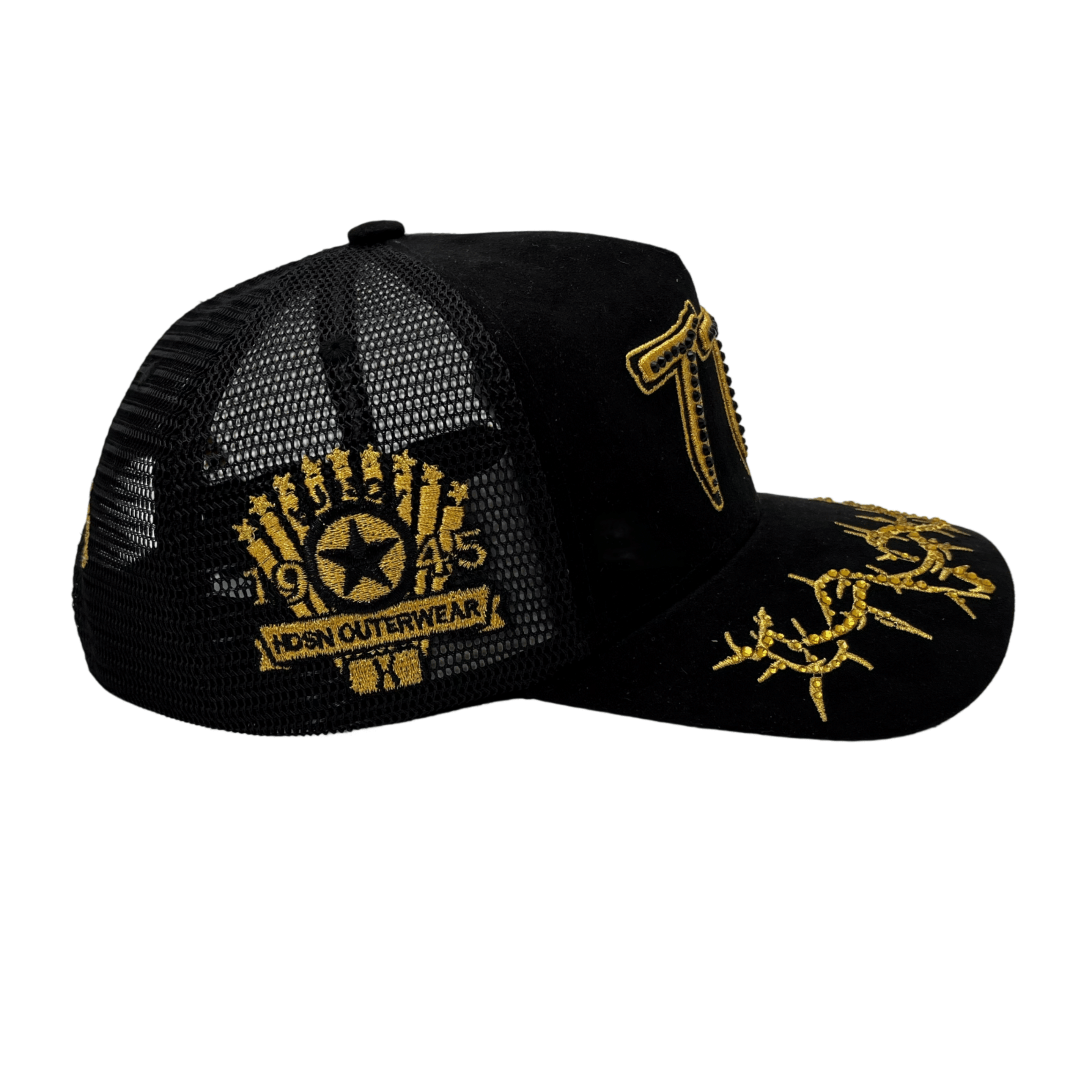 Premium quality black suede rhinestone trucker cap with mesh on side and back panels, adjustable snap, fits all sizes.