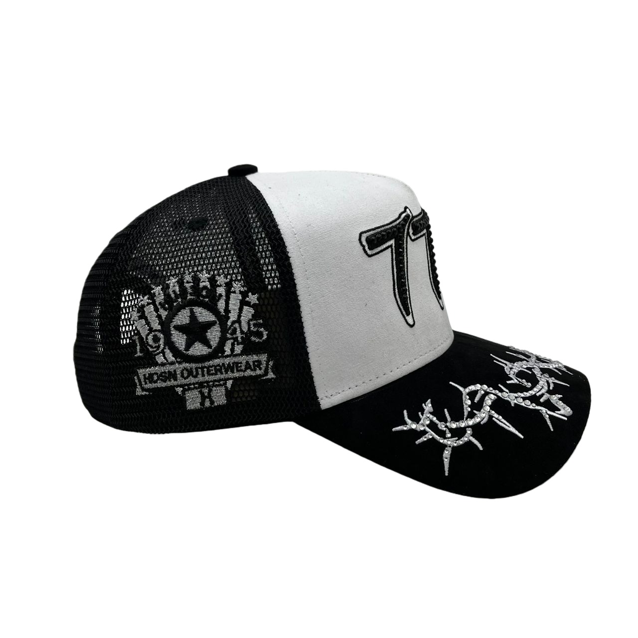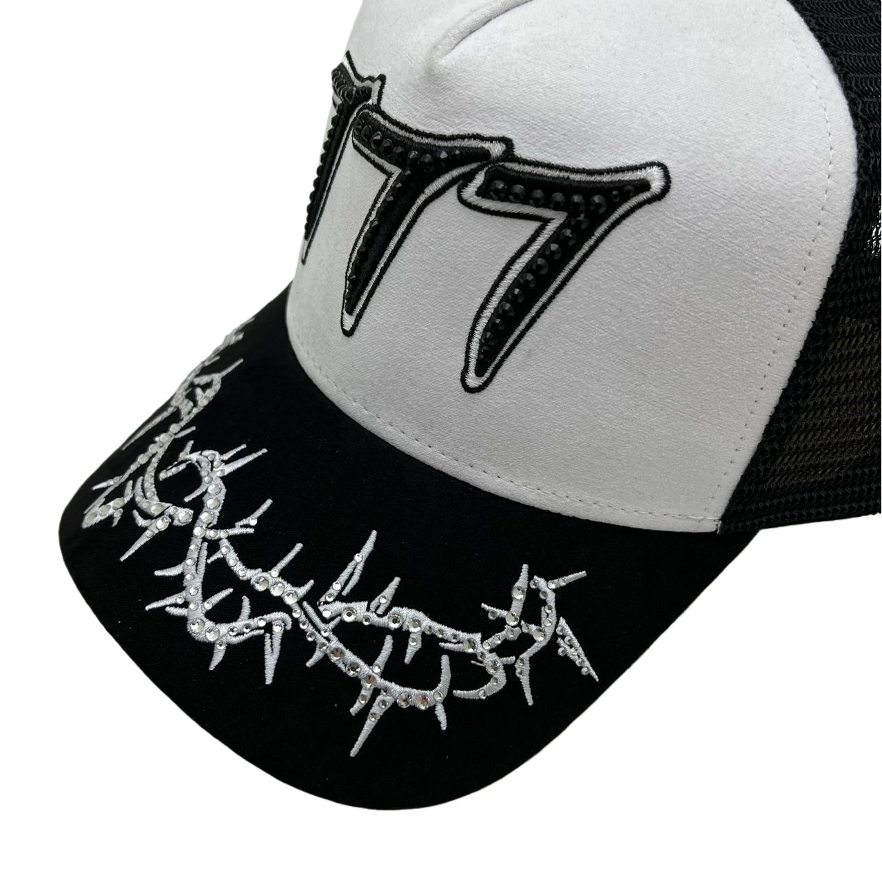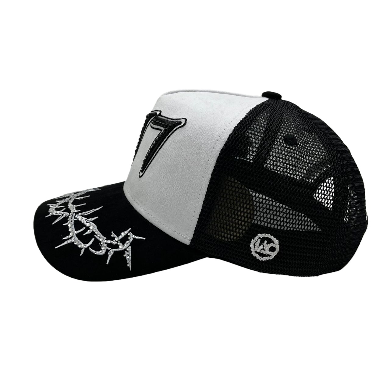 Premium quality white suede rhinestone trucker cap with mesh on side and back panels, adjustable snap, fits all sizes.