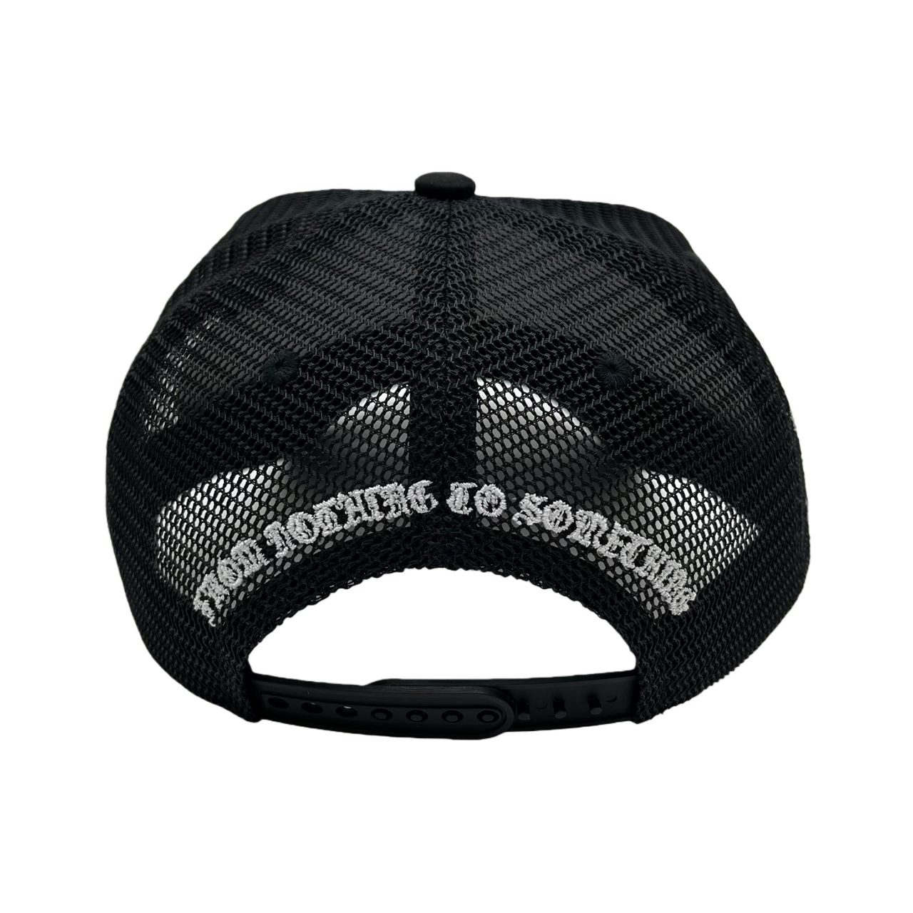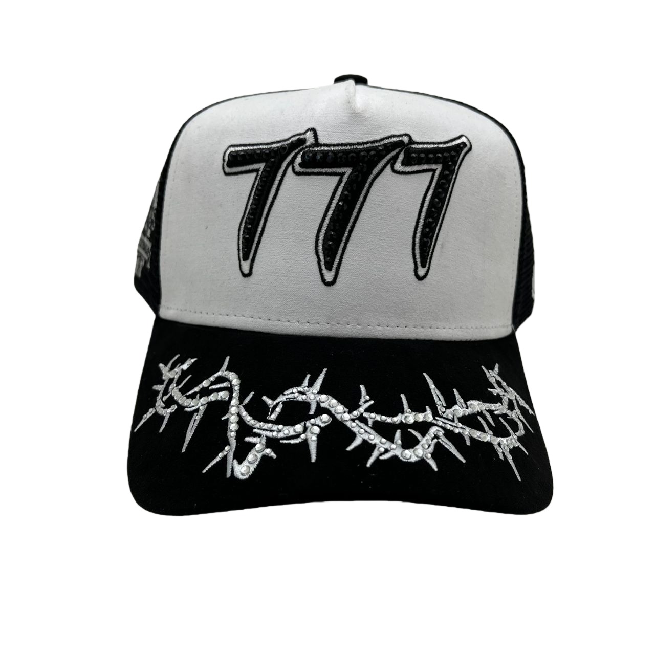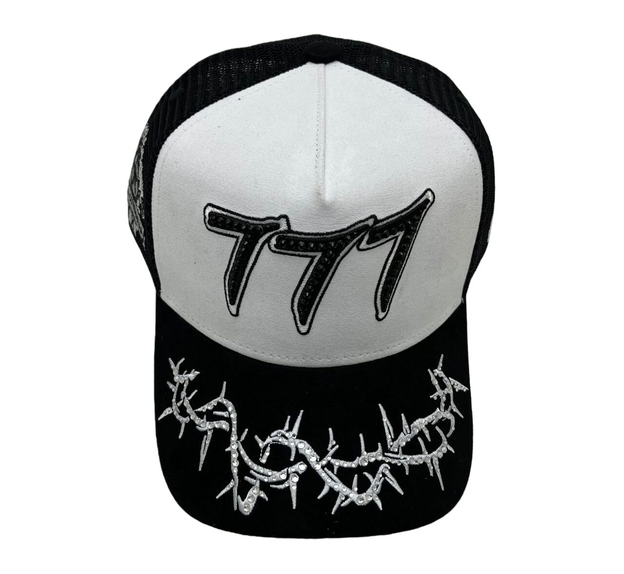 Premium quality white suede rhinestone trucker cap with mesh on side and back panels, adjustable snap, fits all sizes.