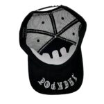 Premium quality white suede rhinestone trucker cap with mesh on side and back panels, adjustable snap, fits all sizes.